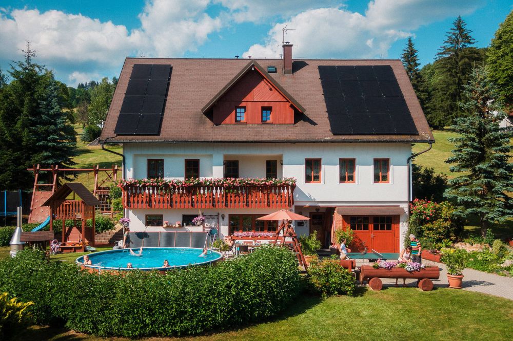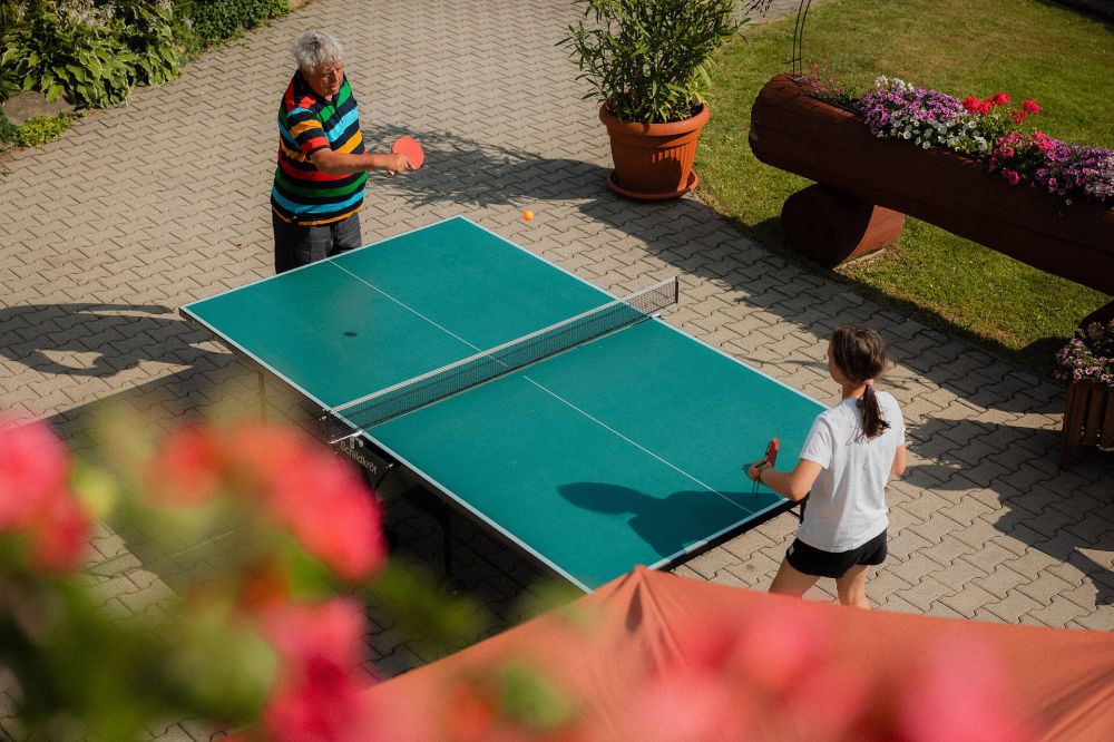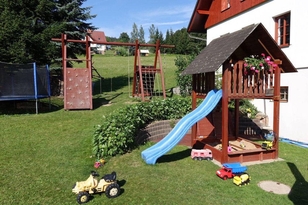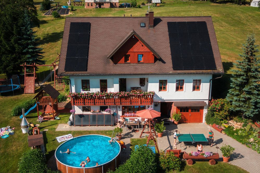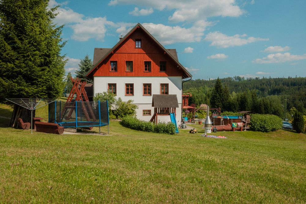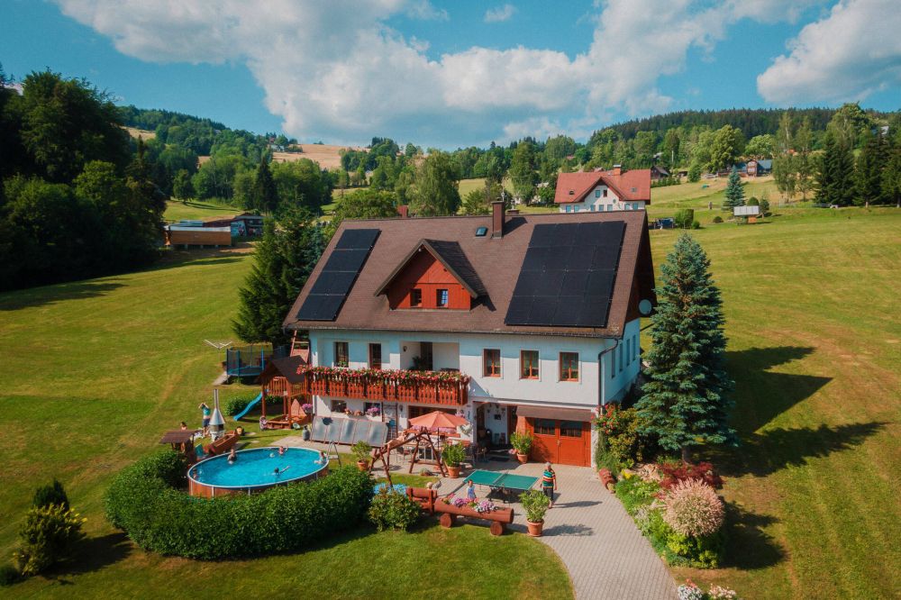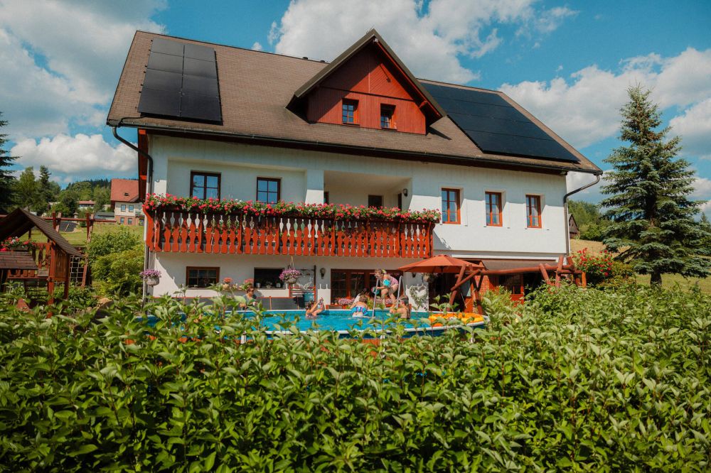 venkovní vyhřívaný bazén, velký dětský koutek, venkovní posezení, stolní tenis